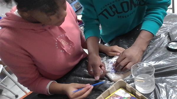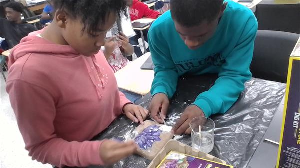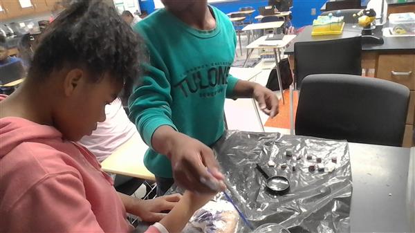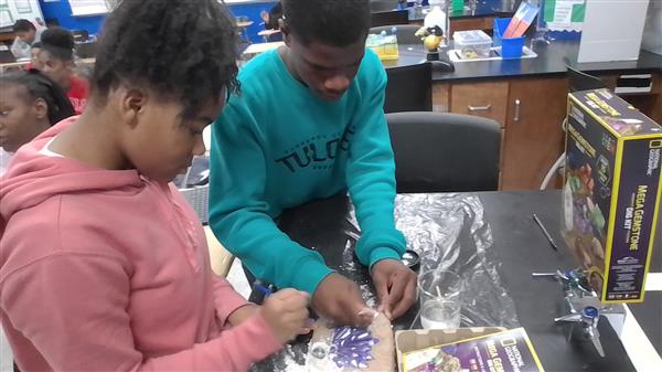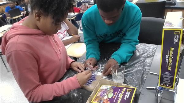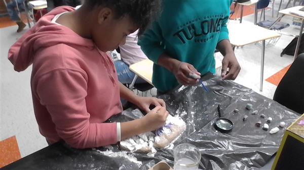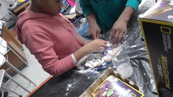 Paleontologist Deonte Reeves and Paleontologist Damaris Bell are using tools to excavate fossils. They find gemstones during this dig.