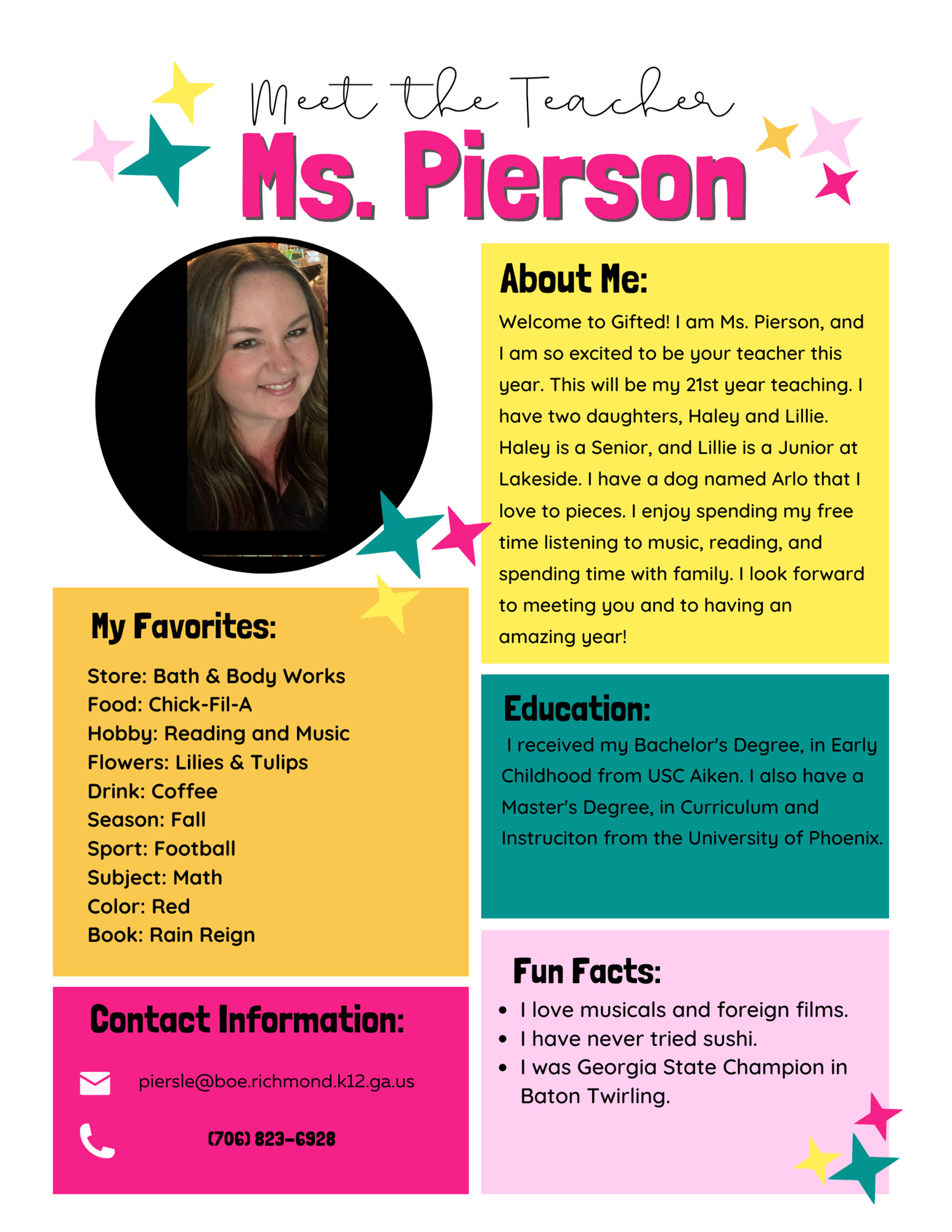 Welcome to the Academic and Creative Enrichment (A.C.E.) program! My name is Ms. Leslie Pierson, and I am the gifted teacher at Glenn Hills Elementary. I work with gifted and talented students in first through fifth grade. Together, A.C.E. students and I will take an educational journey in the arts and sciences in a flexible learning environment with academic rigor and social-emotional learning! I am excited about all the learning that will take place this 2025-2026 school year.